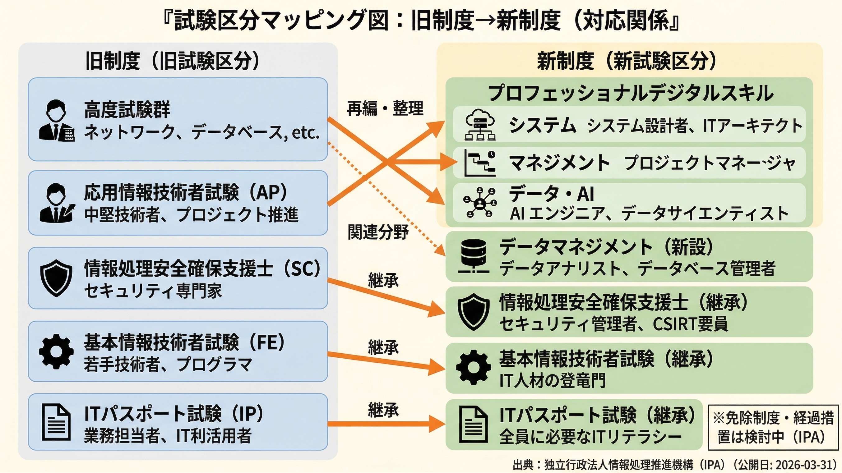 IPAの公表では、現行の応用情報技術者試験と高度試験は大括り化して再編され、プロフェッショナルデジタルスキル試験(仮称)の3区分へ統合される形です。ただし、これは公開日:2026年3月31日付の「検討状況」に基づく案であり、最終決定前の情報です。