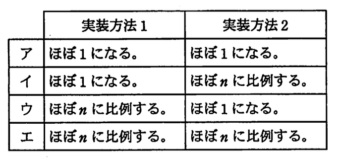 - ウ:実装方法1が比率に比例は誤り。末尾追加も削除もで比率は1。