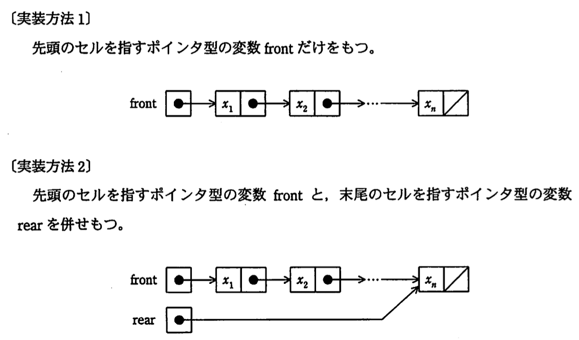 - 実装方法2は末尾ポインタrearがあり、追加はで可能。