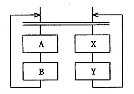 左側U字型内の処理は「A→B」の順序ですが、U字型の形状から実行は「B」が先に開始され、次に「A」が実行されます。右側U字型は「X→Y」の順序で処理されます。