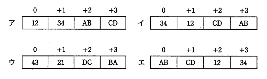 - エ:元の16進数の上位バイトから順にそのまま並べており、ビッグエンディアンの配置である。