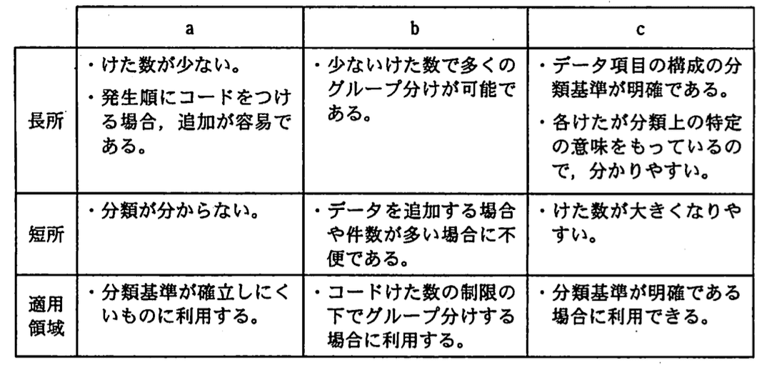 - b(区分コード)は「少ないけた数で多くのグループ分けが可能」だが「データ追加に不便」で、コードけた数制限下のグループ分けに適しています。