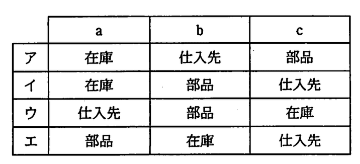 選択肢エは、aが「部品」、bが「在庫」、cが「仕入先」となっており、