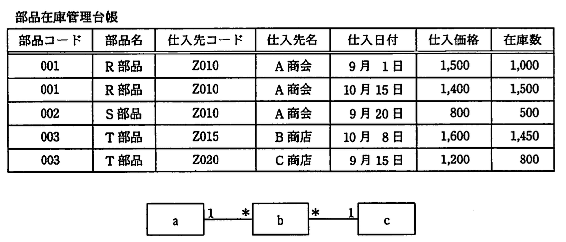 部品在庫管理台帳における、部品、仕入先、在庫の三つのエンティティの関係をデータモデルとして記述した。エンティティa〜cの組合せとして、適切なものはどれか。