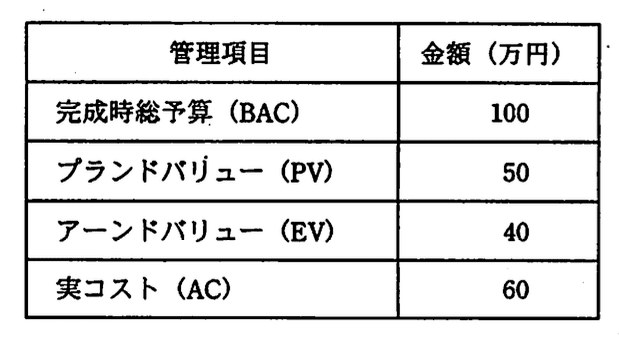 期間 10日のプロジェクトを5日目の終了時にアーンドバリュー分析したところ、表のとおりであった。現在のコスト効率が今後も続く場合、完成時総コスト見積り(EAC)は何万円か。