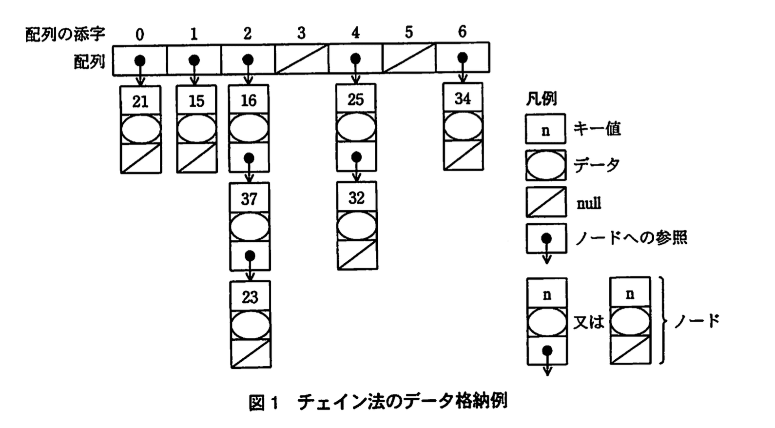 - 図1の table[2] 先頭ノードのキー値は「16」、次が「37」、最後が「23」です。
