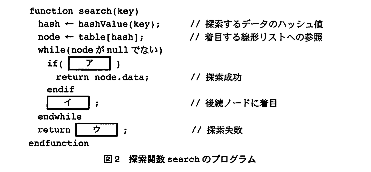 - 問題文は「線形リスト上の探索の際にアクセスするノードの数は、線形リストの長さの平均 n/m に比例する」と述べています。ここで n はデータ件数、m はハッシュ表(配列)の長さです。