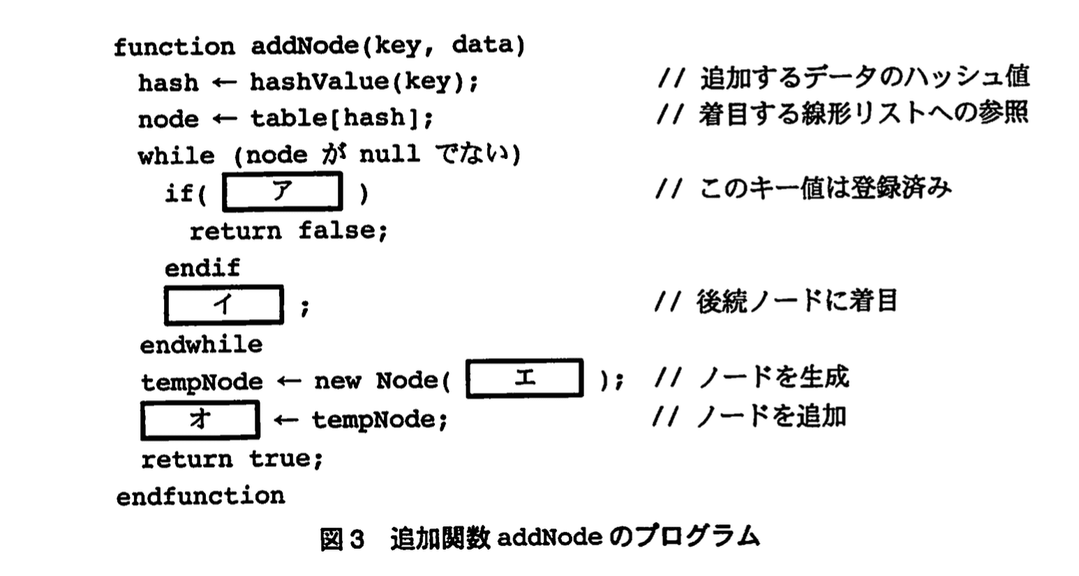 データの追加手続きを実装した関数 addNode の処理手順を次の(1)~(3)に、プログラムを図3に示す。図3中のア、イには、図2中のア、イと同一のものが入る。