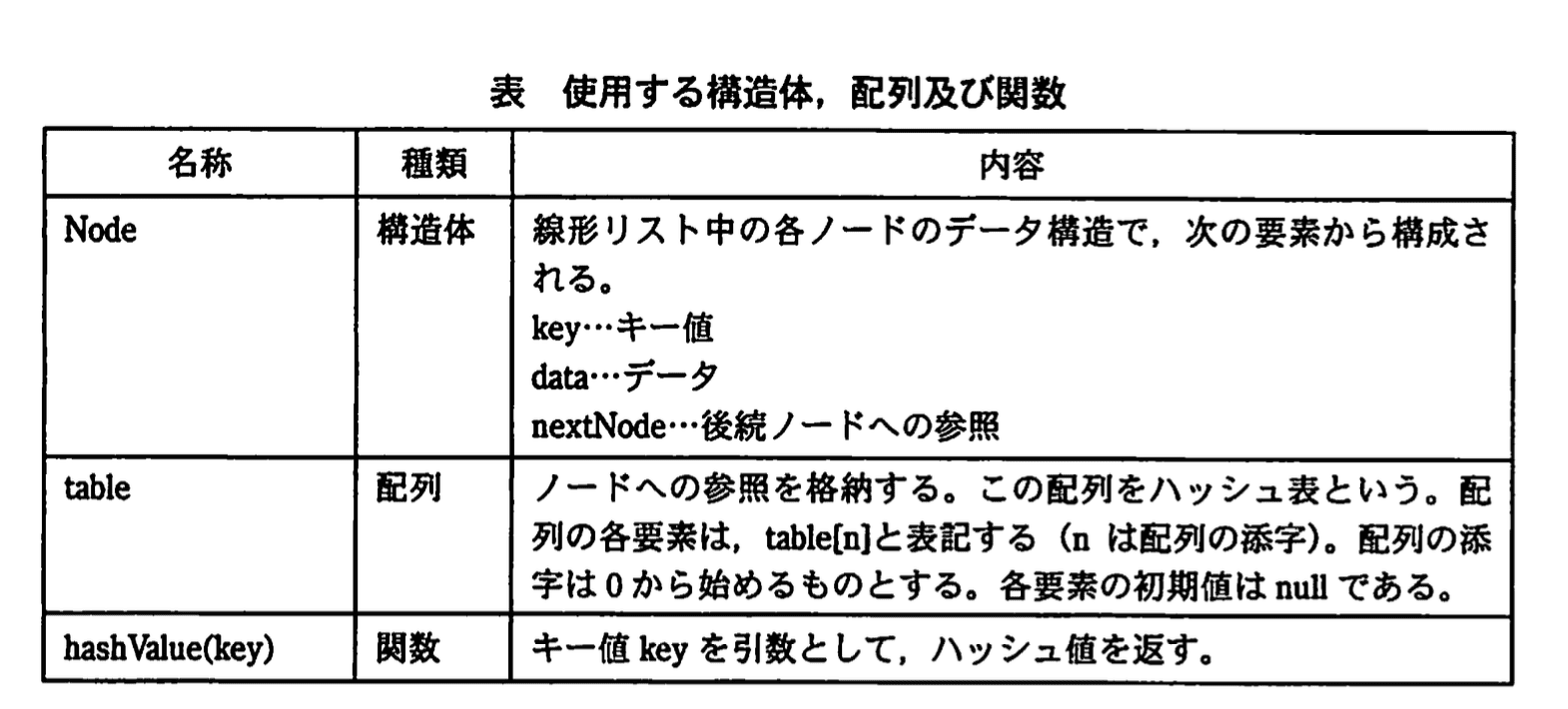 このチェイン法を実現するために、表に示す構造体、配列及び関数を使用する。