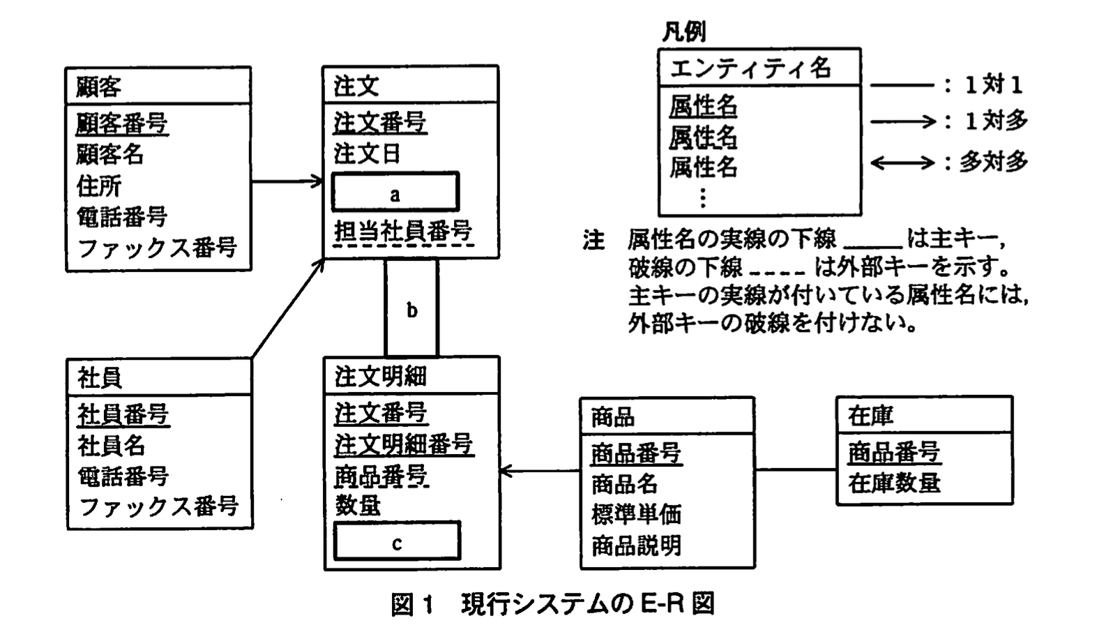 図1中のa〜cに入れる適切な属性名及びエンティティ間の関連を答え、図を完成させよ。図1の凡例に従うこと。属性名は表1又は図1から選び、必要に応じて下線を付けること。