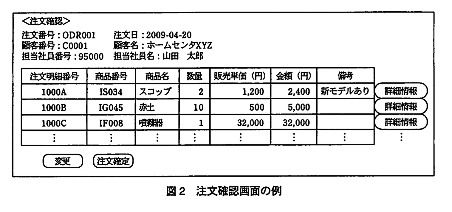 毎年新しいモデル(以下、新モデルという)が出る商品では、その履歴を管理し、顧客が古いモデルの商品を発注しようとした場合に、アドバイスする機能を追加する。具体的には、図2のような注文確認画面を設け、担当社員が注文内容を確認するとともに、備考欄のような表示で、新モデルがあることを知らせることができる。