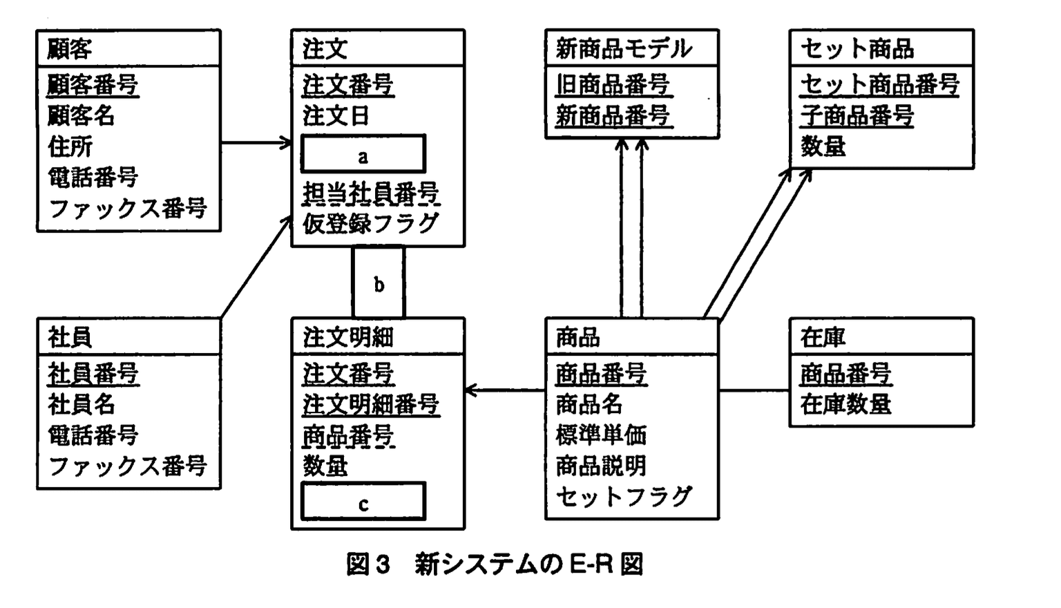 新システムのE-R図を図3に示す。図3中のa~cには、図1中のa~cと同一のものが入る。