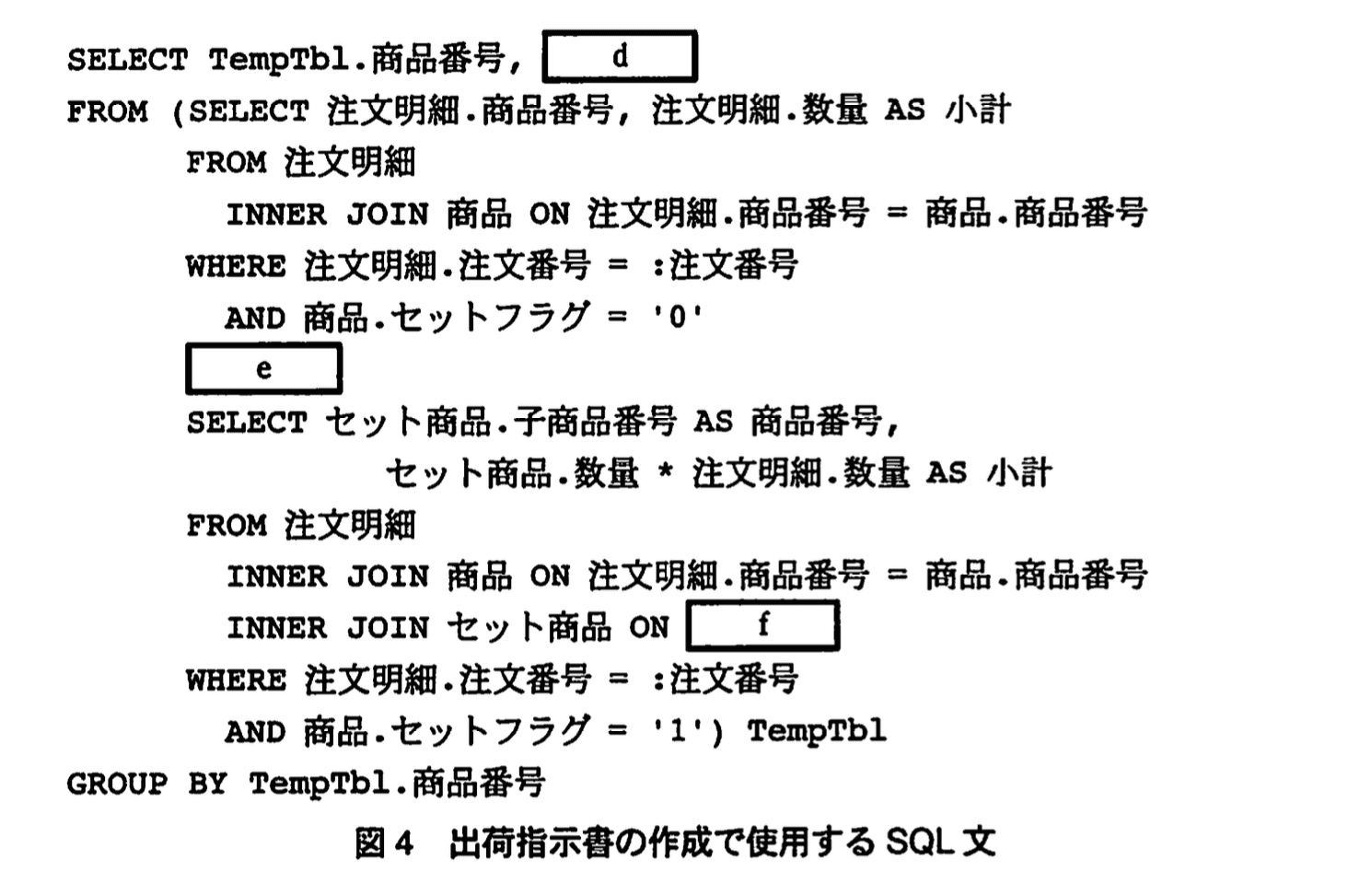 本文中の“(1) セット商品の導入”で記述されているセット商品を導入するためには、現行システムの出荷指示機能を修正する必要がある。新システムにおいて、指定された注文番号の出荷指示を出力するSQL文を図4に示す。図4中のd〜fに入れる適切な句又は式を答えよ。ここで、“:注文番号”は、指定された注文番号を格納するホスト変数である。