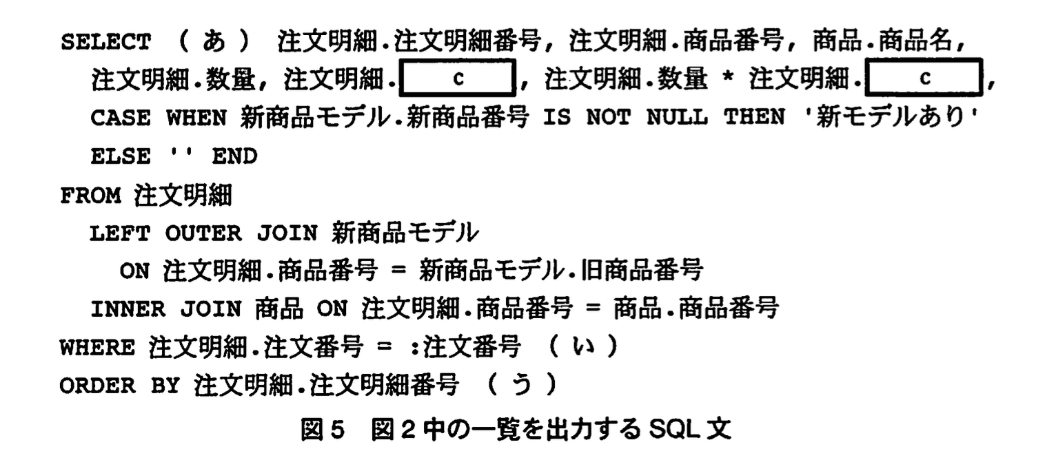 図2中の注文明細一覧を出力するために作成した図5のSQL文を実行したところ、同じ注文明細番号の行が複数出力されてしまった。どのような場合にこの問題が発生するのか、25字以内で述べよ。また、その解決策として、(あ)~(う)のいずれかの場所に符句を追加する必要がある。その場所に追加する字句を答えよ。ここで、“:注文番号”は、指定された注文番号を格納するホスト変数である。図5中のcは、図1中のcと同一のものが入る。