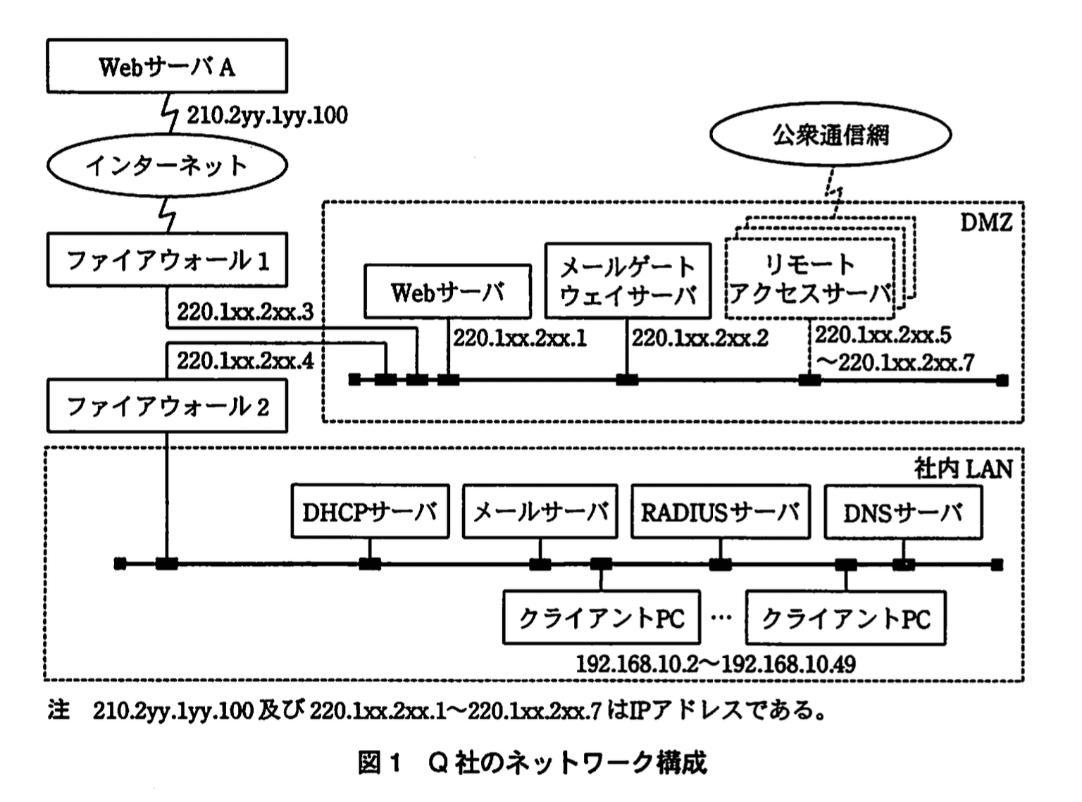 - 【問題文】の注記には「210.2yy.1yy.100及び220.1xx.2xx.1〜220.1xx.2xx.7はIPアドレスである。」とあり、WebサーバAは外部にある旨が明記されています。