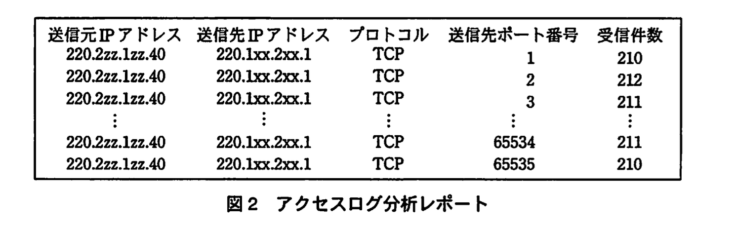 - 問題文には「アクセスログを基に…図2のようなレポートを作成した。この結果から、iの危険性が認められる」と示されています。図2は、同一送信元IPから多数のTCPポートに接続を試みた記録を表しています。