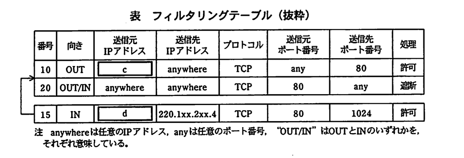 インターネットからaへの通信、及び社内LANからインターネットへの通信は、いずれも送信元IPアドレス、送信先ポート番号及びプロトコルを参照して、アクセスを制御している。また、bから社内LANへの通信は、次の動的パケットフィルタリング機能によって通過させるもの以外、すべて遮断する。