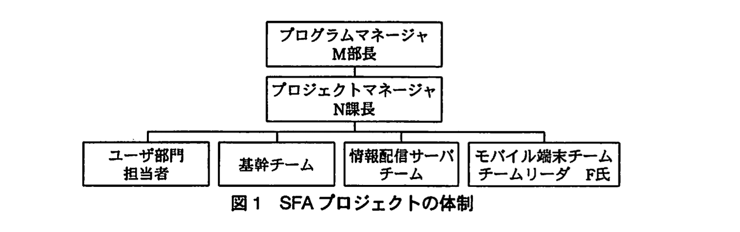 SFAプロジェクトは、図1の体制で実施される。L社システム部のM部長が、プログラムマネージャとしてSFAプロジェクトを含めた複数プロジェクトを管理する。L社システム部のN課長が、SFAプロジェクトのプロジェクトマネージャである。ユーザ部門担当者は、要件定義やレビューに参加する。基幹チーム及び情報配信サーバチームはL社が担当し、各チームにチームリーダがいる。モバイル端末チームはE社が担当し、チームリーダはE社のF氏である。