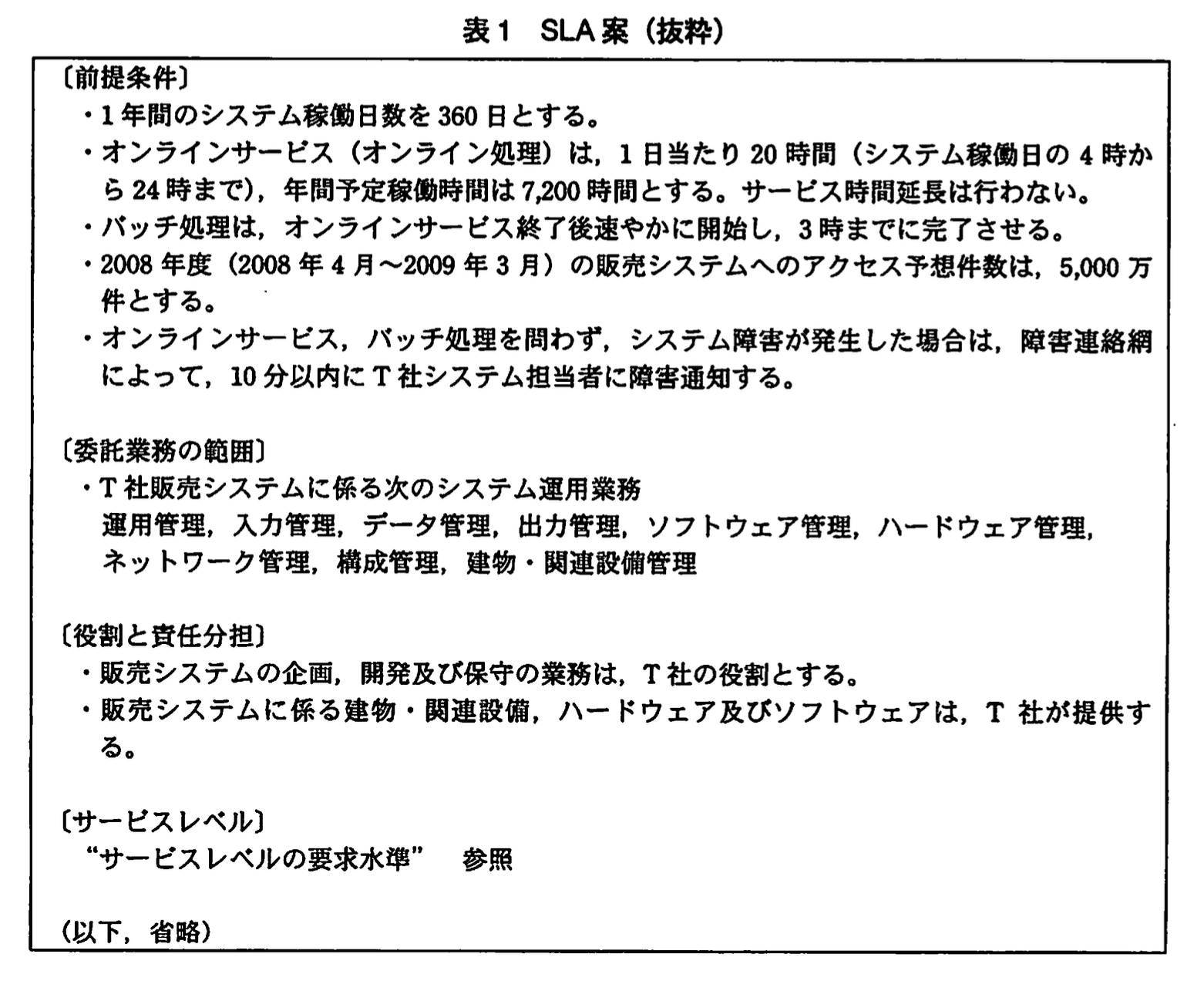 T社は、健康食品の製造・販売業を営んでいる。2006年1月にインターネット販売システム(以下、販売システムという)を自社で構築し、システム運用・保守を行ってきた。2008年4月、システムの企画、開発及び保守の業務を自社に残し、システム運用業務をT社に委託した。当時両社は、2009年4月に正式なSLAを締結することを目指して1年間試行することに合意し、表1に示すSLA案を作成した。