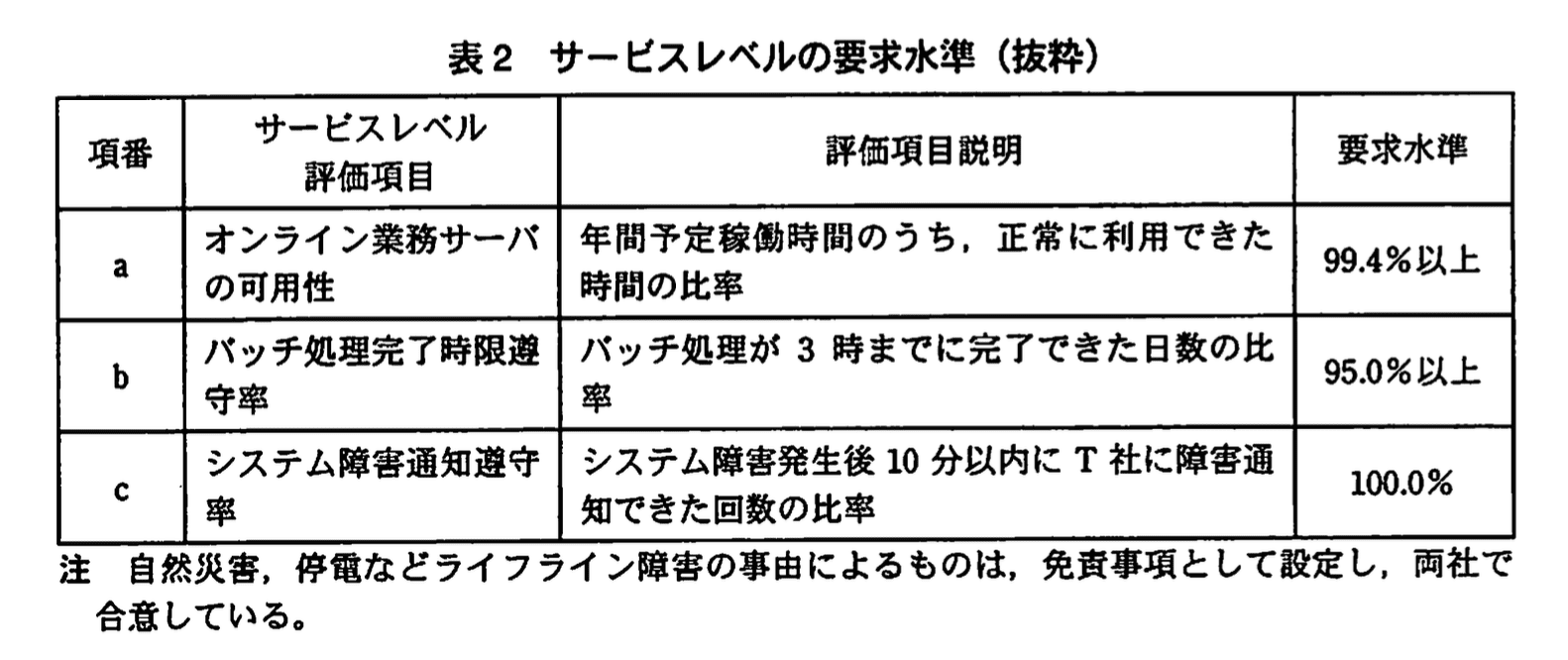 表2 項番c は「システム障害通知遵守率」で、評価項目説明は「システム障害発生後10分以内にT社に障害通知できた回数の比率」、要求水準は「100.0%」です。したがって、10分を超える通知遅延は一件も許されません。 -