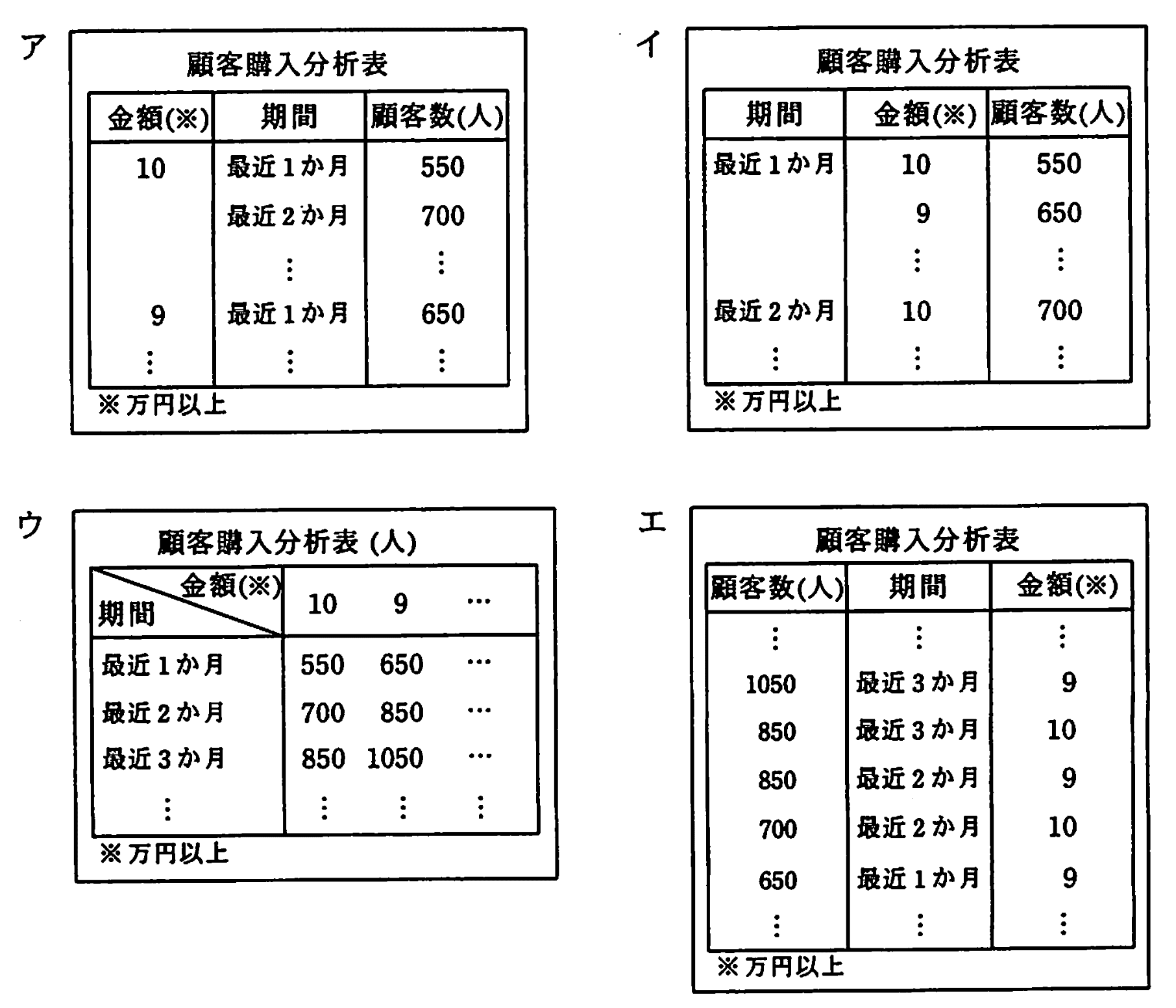 選択肢ウは、期間を行見出し、購入金額を列見出しにして、交差するセルに顧客数を配置したクロス集計表です。この形式は、期間別・金額別の顧客数を一目で比較でき、優良顧客の傾向分析に最も適しています。表のタイトルや注記も明確で、分析表としての完成度が高い点が評価されます。