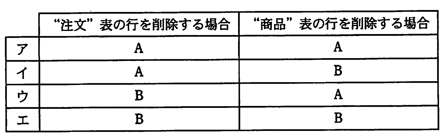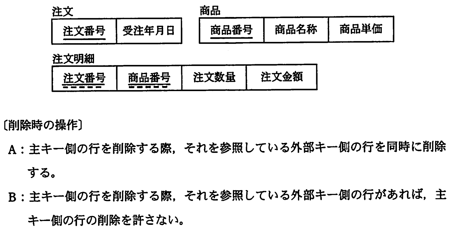 関係データベースの“注文”表又は“商品”表の行を削除する場合の“注文明細”表に対する操作【午前2 解説】