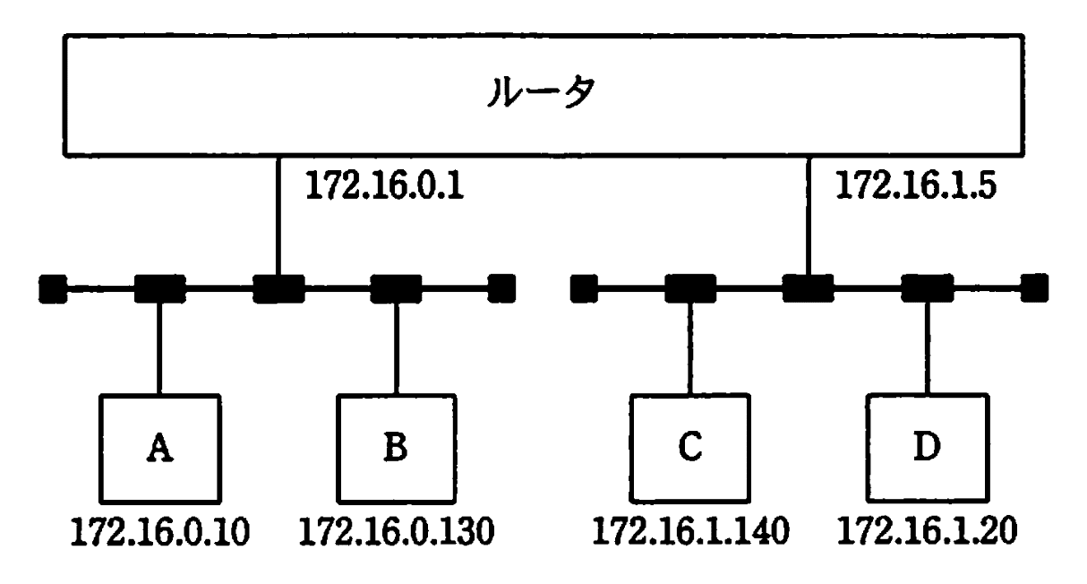 ルータの左ポートは「172.16.0.1」、右ポートは「172.16.1.5」で、それぞれのサブネットマスクは255.255.255.128(/25)です。
