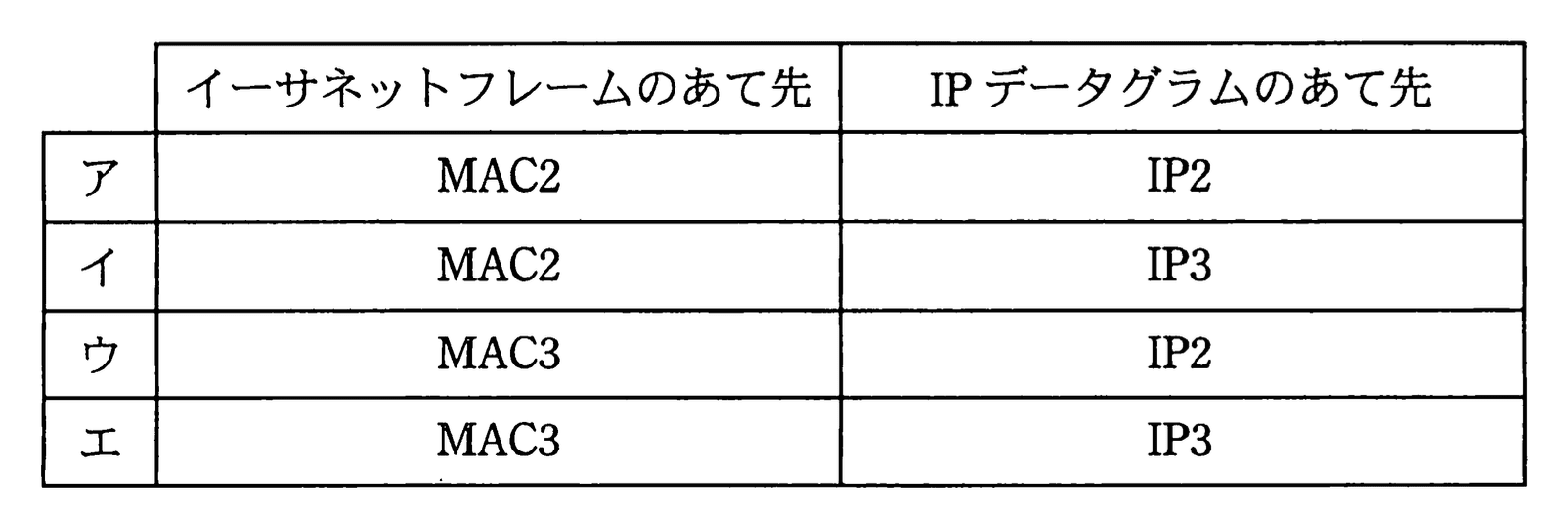 したがって、イーサネットフレームの宛先はMAC3、IPデータグラムの宛先はIP2が正しい組み合わせです。