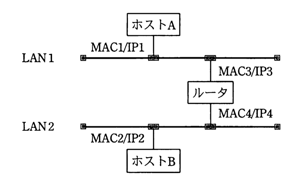 - 結論:LAN1上のイーサネットフレームの宛先はMAC3(ルータのLAN1側インタフェース)、IPデータグラムの宛先はIP2(ホストBのIPアドレス)である。