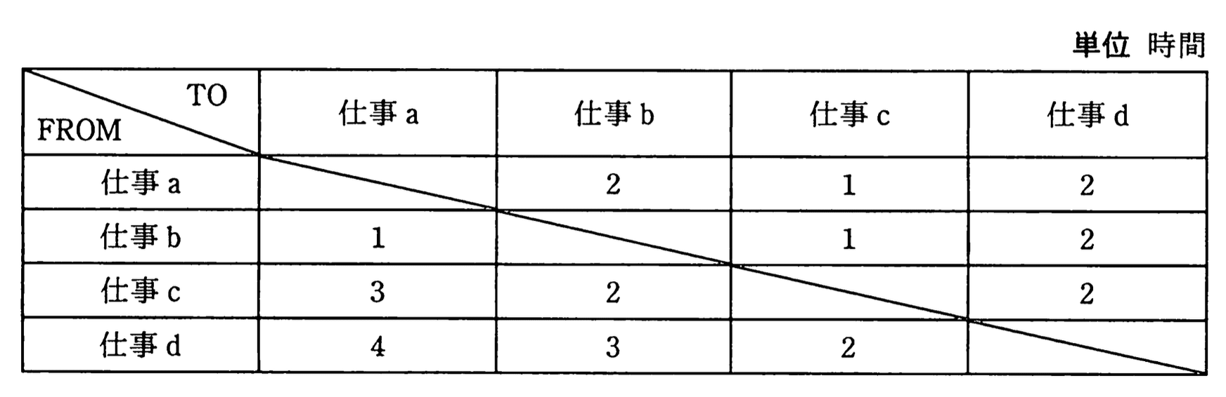 例えば、順序 a→c→b→d の場合、段取り時間は a→c(1) + c→b(2) + b→d(2) = 5時間ですが、他の順序を検討すると4時間にまで減らせます。