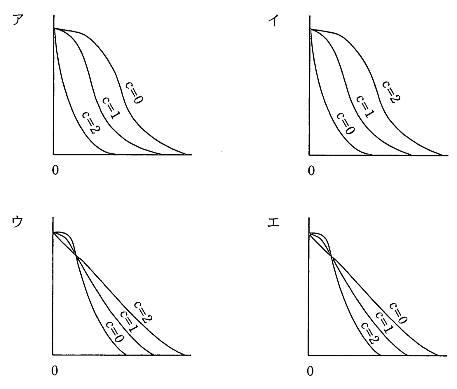 したがって、c=0 の曲線は最も左寄り(厳しい)、c=2 の曲線は最も右寄り(緩い)となり、これを正しく表しているのが選択肢イです。