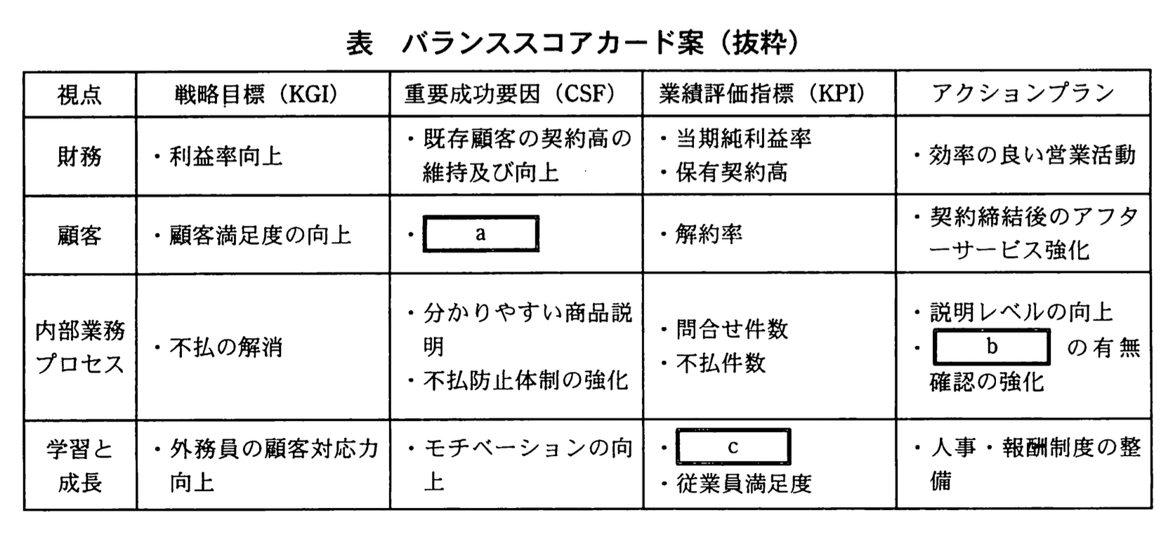 A: 顧客訪問回数は顧客視点の CSF「訪問活動の強化」などには有効ですが、モチベーションや離職率を直接表す指標ではないため、本問の c には適しません。