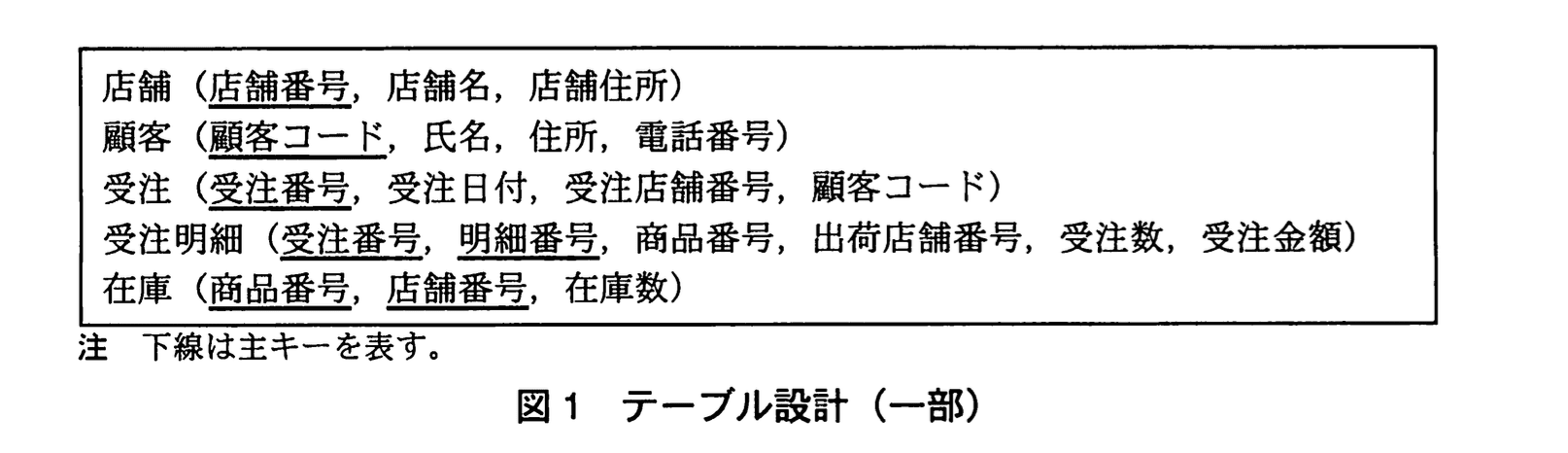 Y君は、新システムのデータベースのテーブルを設計した。設計したテーブルの一部を図1に示す。