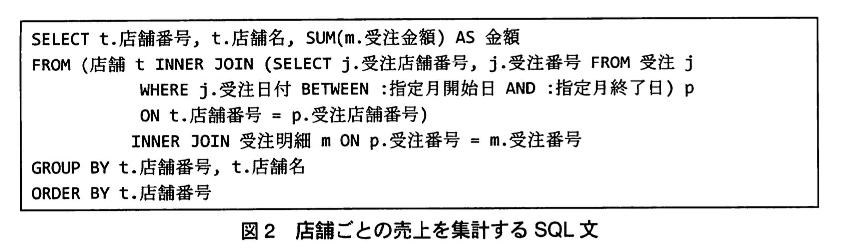 「SELECT t.店舗番号、t.店舗名、SUM(m.受注金額) AS 金額 FROM (店舗 t INNER JOIN …)」