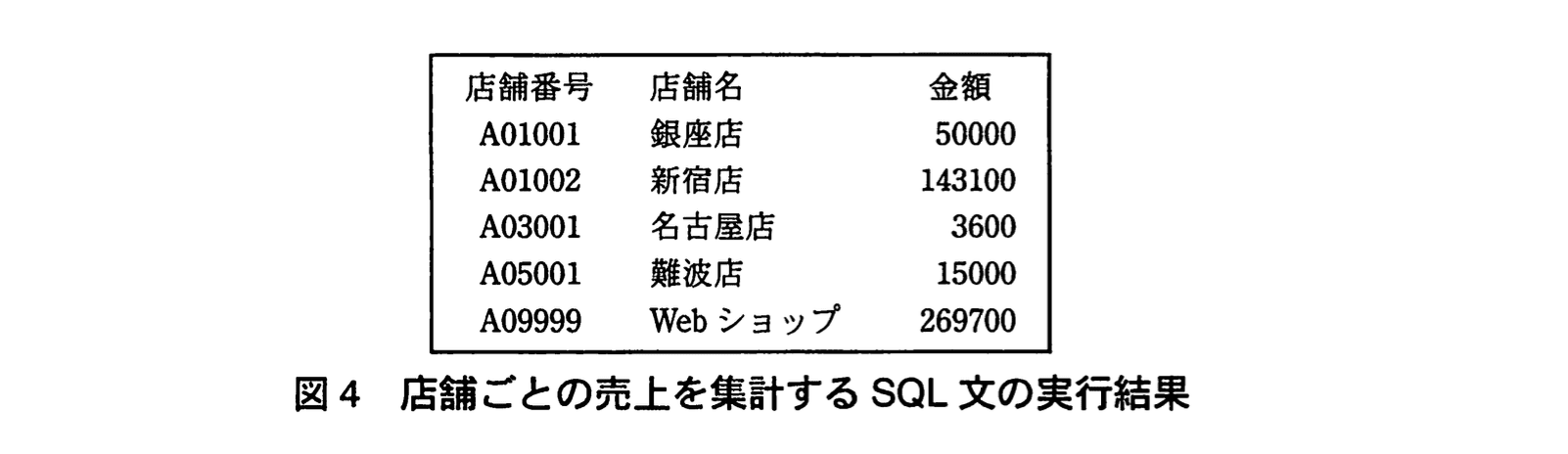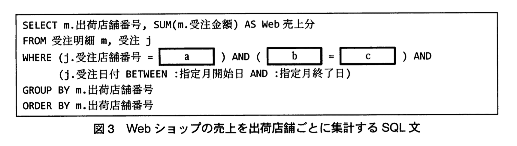 - 図3の SQL は SELECT m.出荷店舗番号, SUM(m.受注金額) AS Web売上分 … GROUP BY m.出荷店舗番号 という構造なので、表示される列は