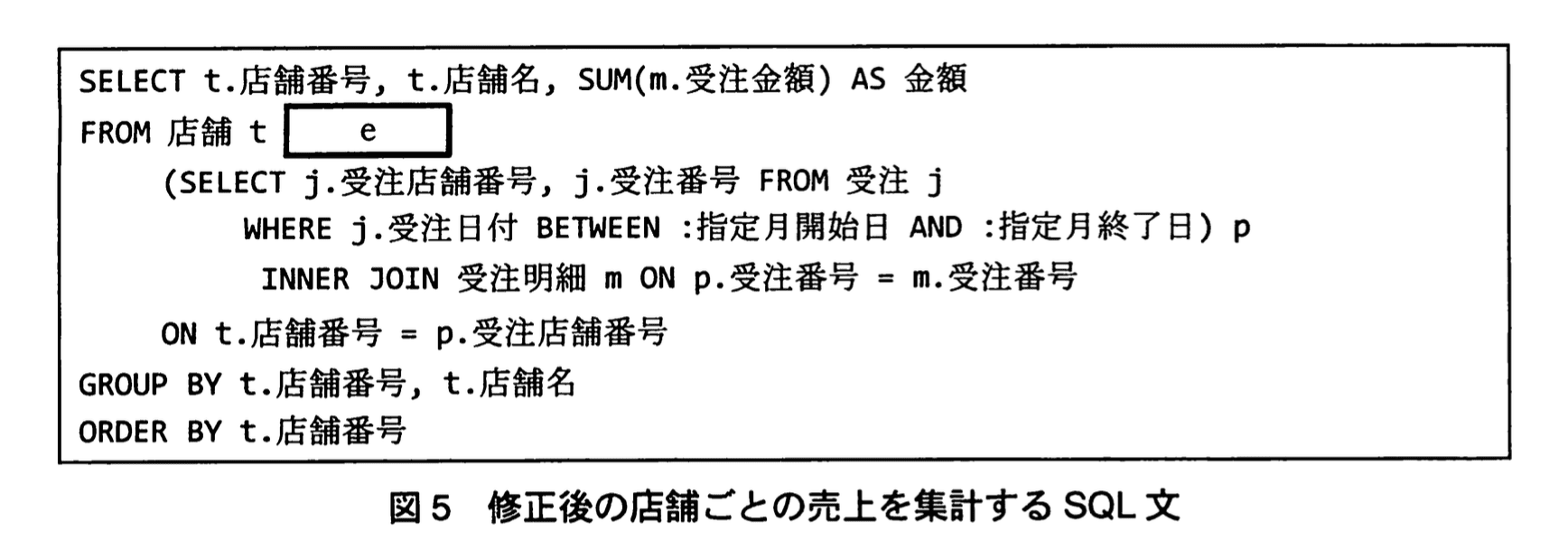 Z係長は図4の出力された結果を見て、このSQL文では、集計の対象となる期間にd店舗の場合は、店舗ごとの売上の集計に出力されないことを指摘した。Y君がSQL文を図5のように修正して実行したところ、期待された結果が得られた。