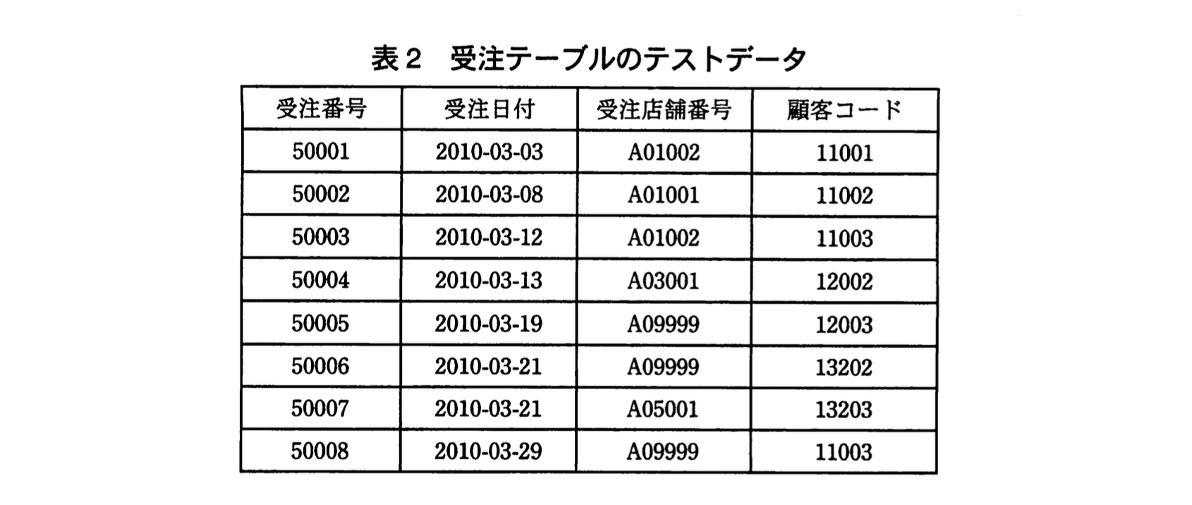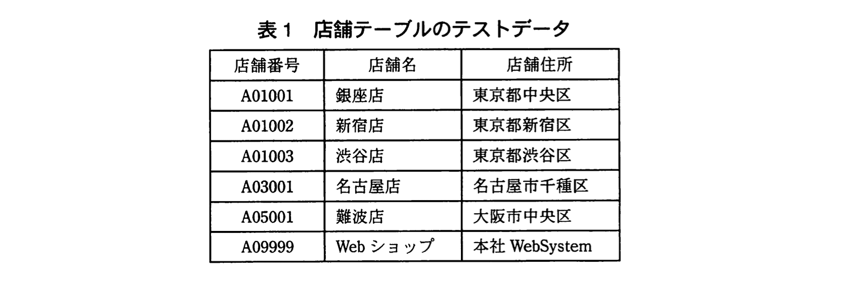 テストデータを見ると、表1にある「A01003 渋谷店」は、