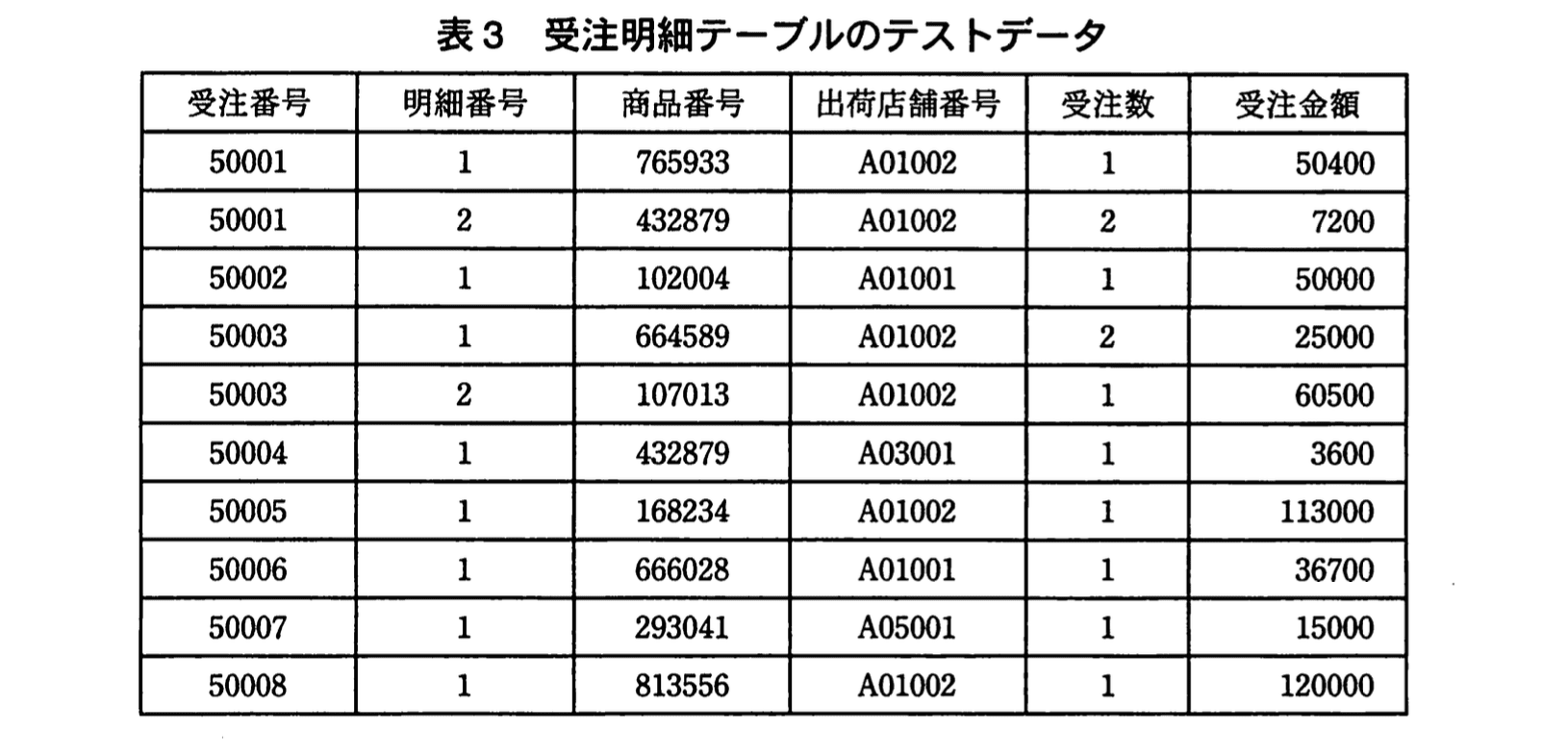 • 受注番号 “50008” : 出荷店舗番号 “A01002” / 受注金額 120000