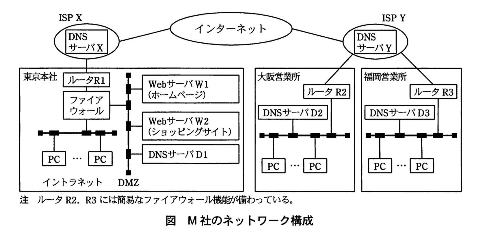 M社は、ある製品の開発、販売を手掛ける企業であり、東京本社のほかに、大阪と福岡に営業所をもっている。自社のホームページは東京本社に設置したWebサーバ W1 で運営しており、自社製品のショッピングサイトは同じく東京本社に設置した別のWebサーバ W2 を使っている。M 社のWebサーバ W1、W2 のホスト名の情報は、東京本社に設置した DNSサーバ D1 で管理している。東京本社はインターネットサービスプロバイダ(以下、ISPという)X と、大阪営業所及び福岡営業所は ISP Y と契約してインターネットに接続している。M 社のネットワーク構成を図に示す。また、M 社の PCに設定されている DNSサーバの情報を表に示す。