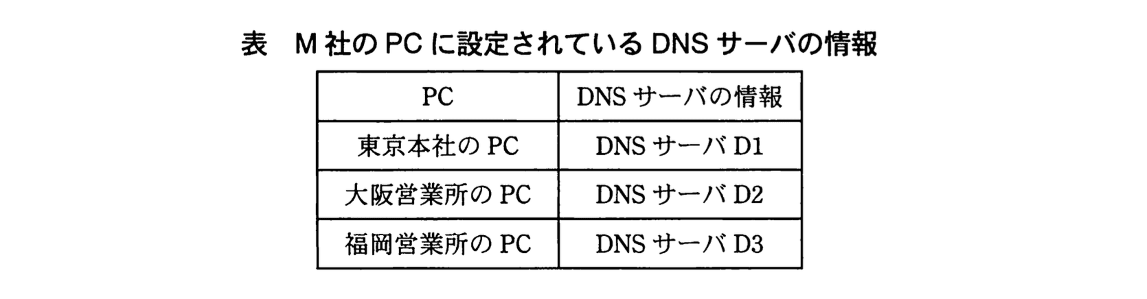 - 福岡営業所のPCは外部のDNSではなく自拠点の「DNSサーバ D3」を利用しているため、キャッシュを汚染されたのは「DNSサーバ D3」と推論できます。