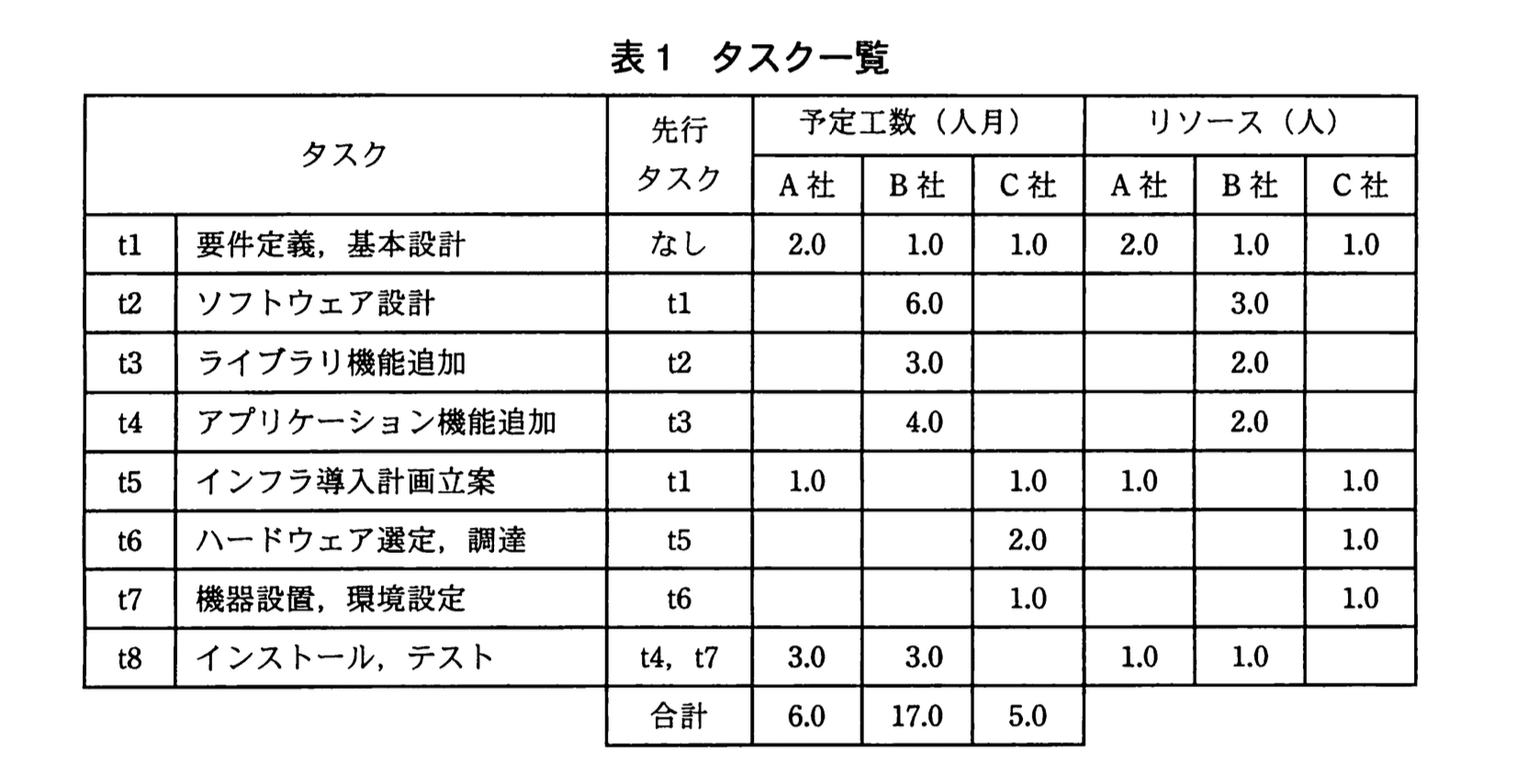 プロジェクトを完了させるために必要なタスクを表1に示す。各社について、表1のリソース欄に値が入っていないタスクは作業スコープ外である。