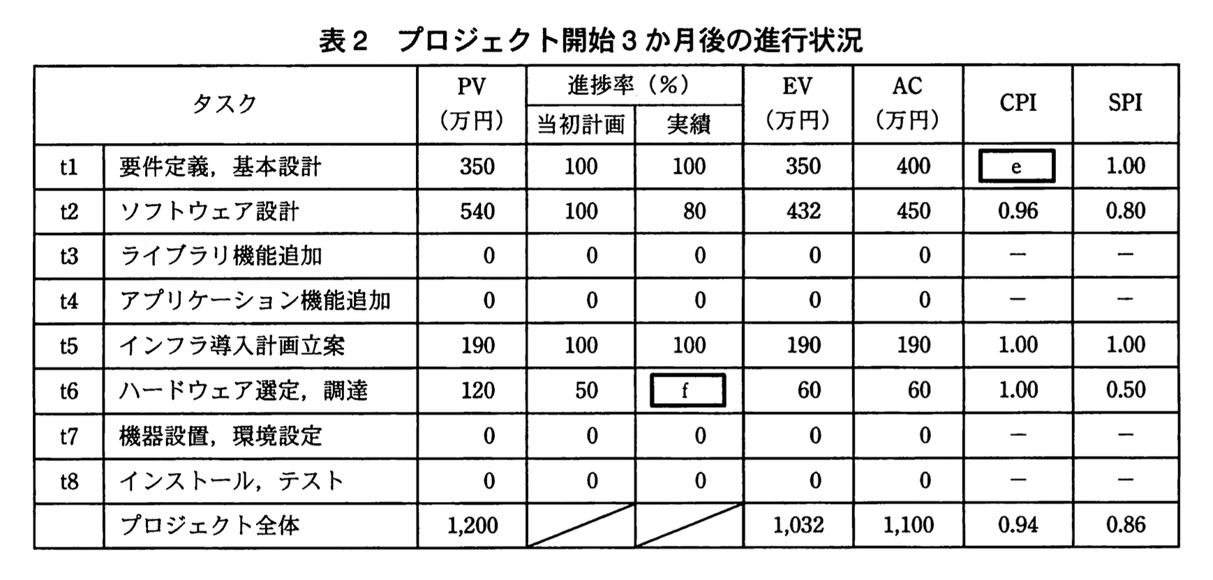 プロジェクト開始から3か月の時点で、A社、B社、及びC社から報告された進捗率をもとに、EVMで用いる値を算出し、表2を作成した。