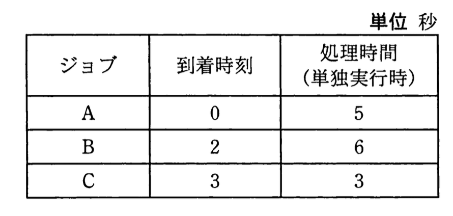 - ジョブの到着時刻順に並べる(A:0秒、B:2秒、C:3秒)。