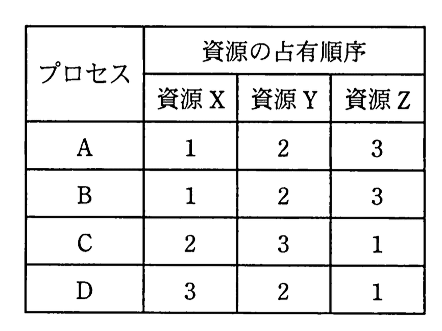 プロセスAは資源X→Y→Zの順に占有します。一方、プロセスCはX→Y→Zの順序が2→3→1、つまりY→Z→Xの順に占有し、プロセスDは3→2→1、つまりZ→Y→Xの順に占有します。