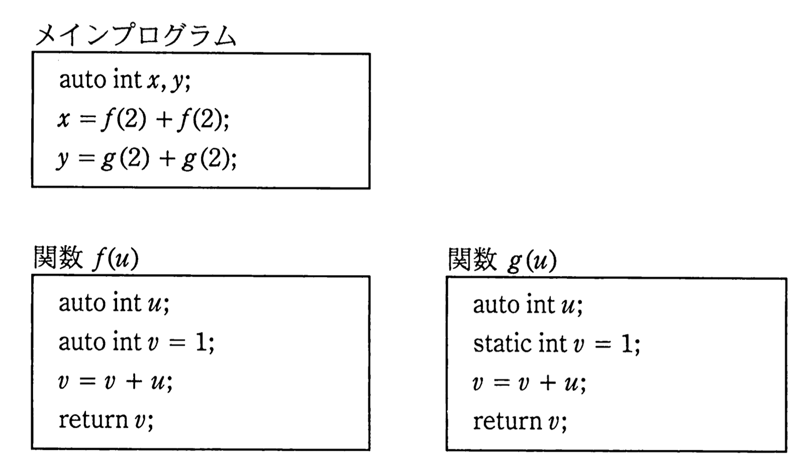 - 根拠:fのvはautoで毎回初期化されるが、gのvはstaticで値が保持されるため累積されます。
