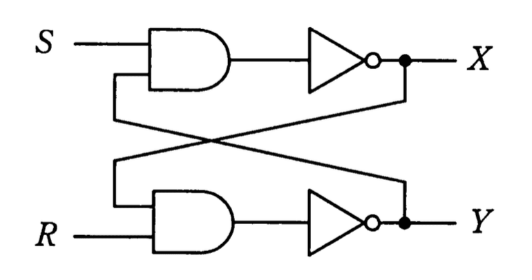 この回路はS,R入力をそれぞれANDゲートとインバータで処理し、出力X,Yを相互にフィードバックするクロスカップル回路です。