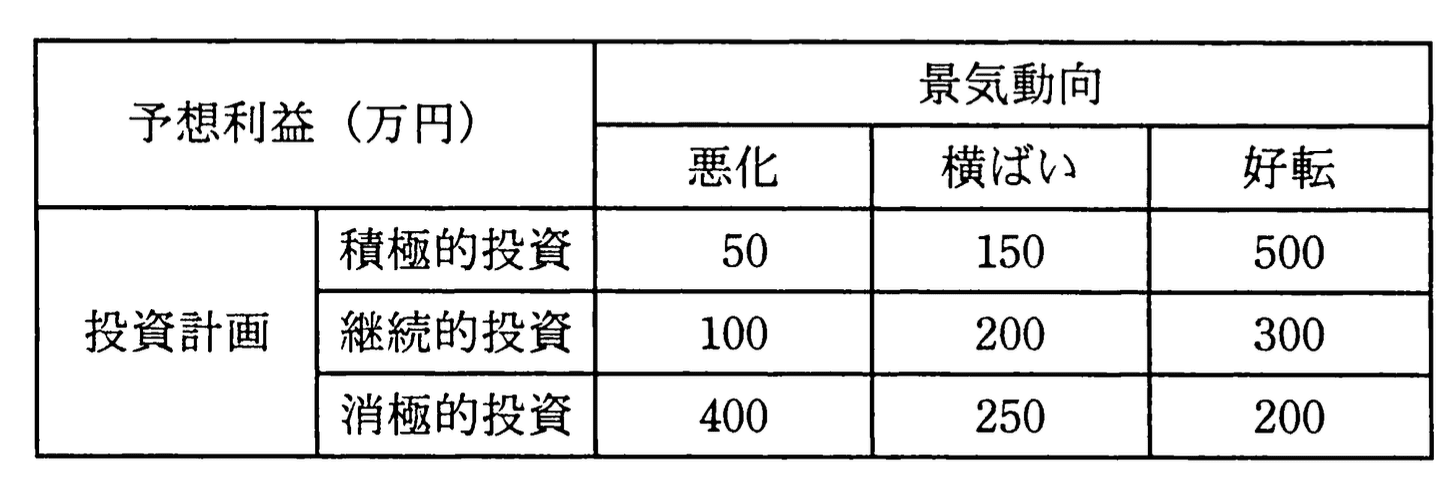 経営会議で来期の景気動向を議論したところ、景気は悪化する、横ばいである、好転するという三つの意見に完全に分かれてしまった。来期の投資計画について、積極的投資、継続的投資、消極的投資のいずれかに決定しなければならない。表の予想利益については意見が一致した。意思決定に関する記述のうち、適切なものはどれか。