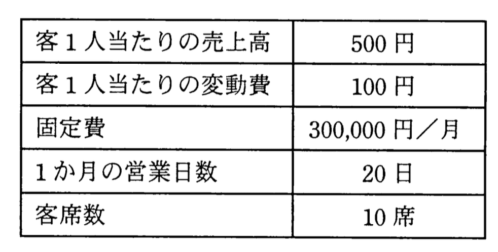 1か月の営業日は20日、客席数は10席なので、1日あたりの必要客数は