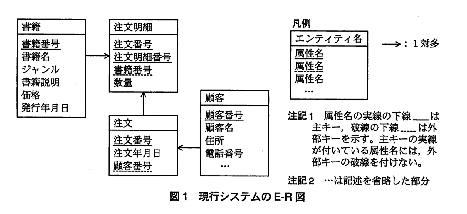 Y社は、インターネットで個人向けに書籍を販売する書籍販売サイトを運営している。書籍販売サイトでの顧客からの注文を受け付ける注文管理システム(以下、現行システムという)では、書籍情報、注文情報に加えて、顧客の会員情報を管理している。現行システムのE-R図を図1に示す。現行システムでは、E-R図のエンティティ名を表名、属性名を列名にして、適切なデータ型で表定義した関係データベースによって、データを管理している。