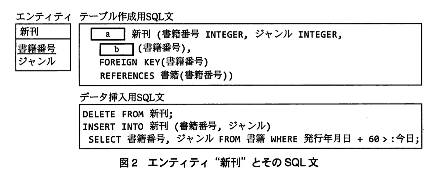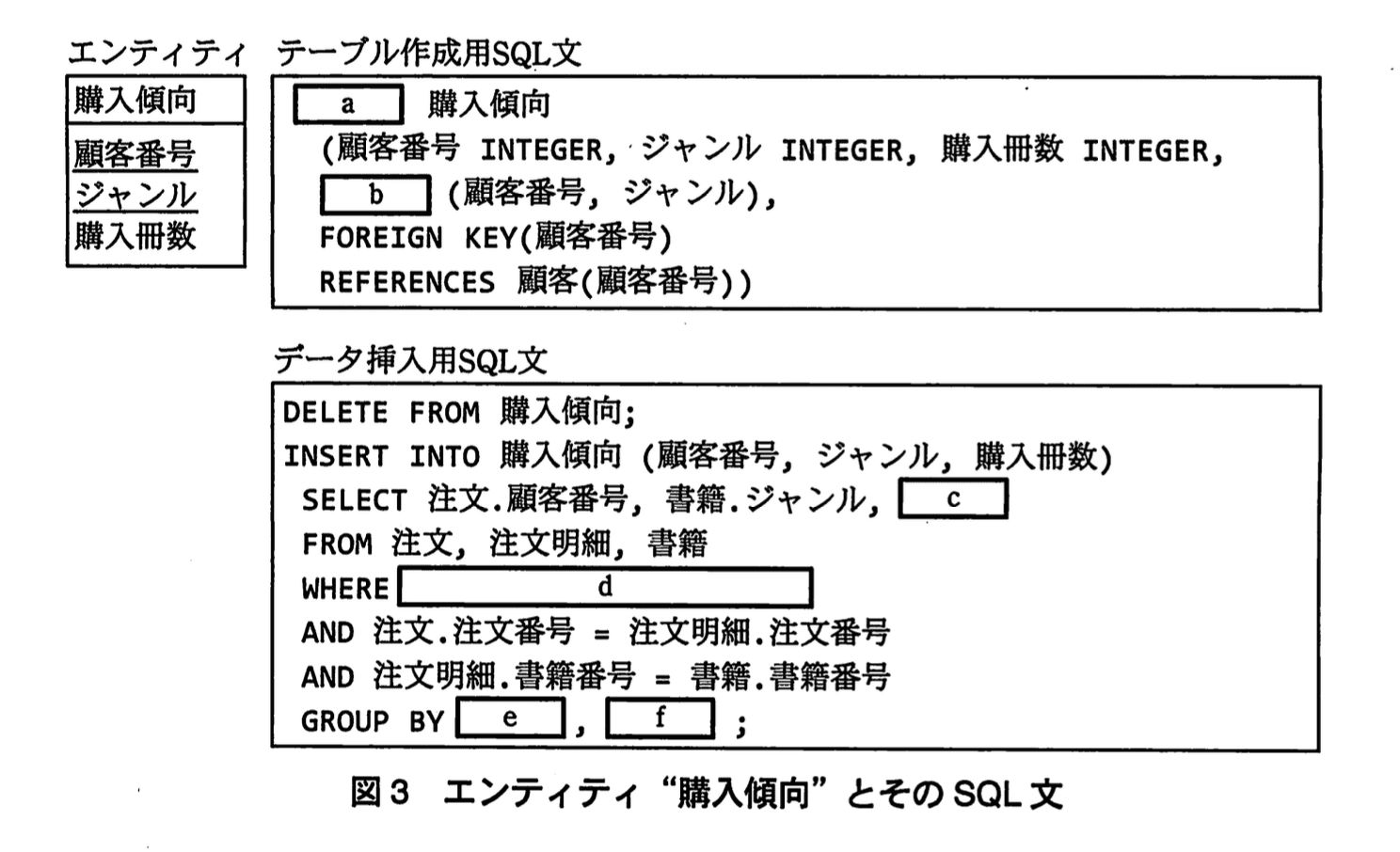REFERENCES 書籍(書籍番号)) - 先頭の [ a ] には、SQL において新しい表を作成する命令が入る必要があります。表を生成する DDL は “CREATE TABLE …”。したがって [ a ]=CREATE TABLE が妥当です。